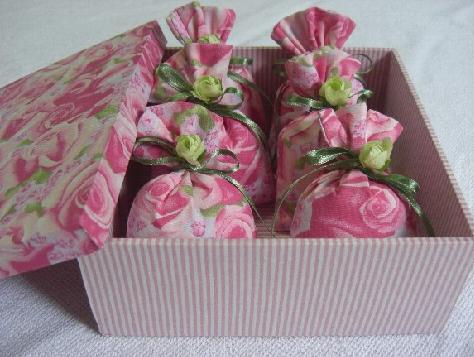Caixa em mdf, forrada em tecido, contendo seis sachets perfumados,