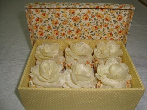 decorados com botão de rosas e fita de cetim.